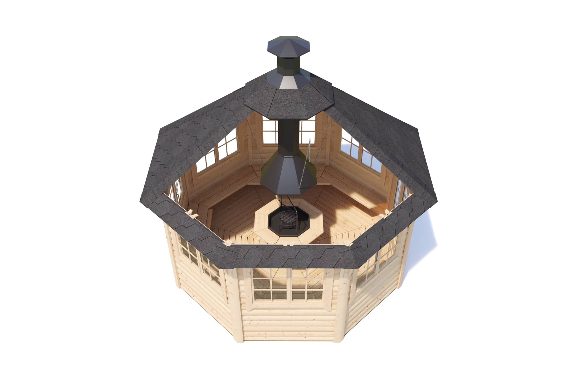 Lusthuset levereras komplett med grill, grillbord och rökpipa. Taket är försett med takshingel – färdigmonterat förutom i hörnen, vilket gör det enkelt att färdigställa på plats.